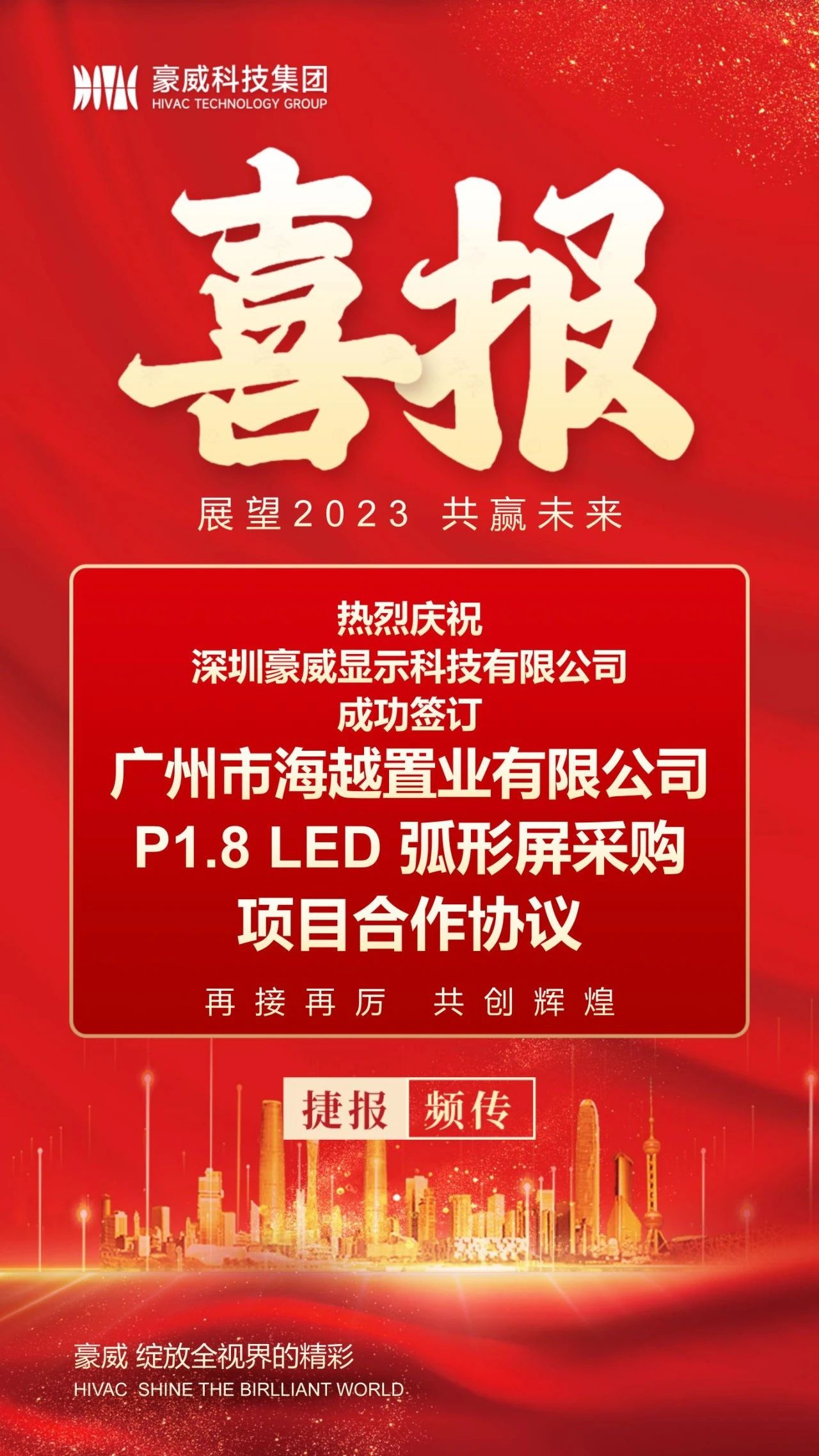 热烈庆祝!kaiyun入口科技集团与广州市海越置业有限公司成功签订P1.8 LED 弧形屏采购项目合作协议!